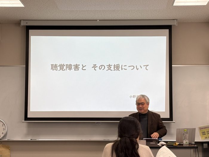 小野康二先生(熊本県聴覚障害者情報提供センター元所長)より、きこえ方の多様性や、大学生活における情報保障の重要性についてご講義いただきました 。