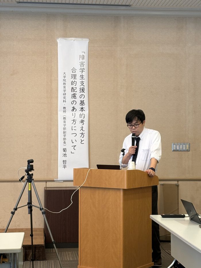 今年度は、令和7年10月16日(木)に、大学院教育学研究科教授(教育学部副学部長)・菊池哲平先生を講師にお迎えし、「障害学生支援の基本的な考え方と合理的配慮のあり方について」をテーマに、ハイブリッド形式(対面+オンライン)で実施しました。